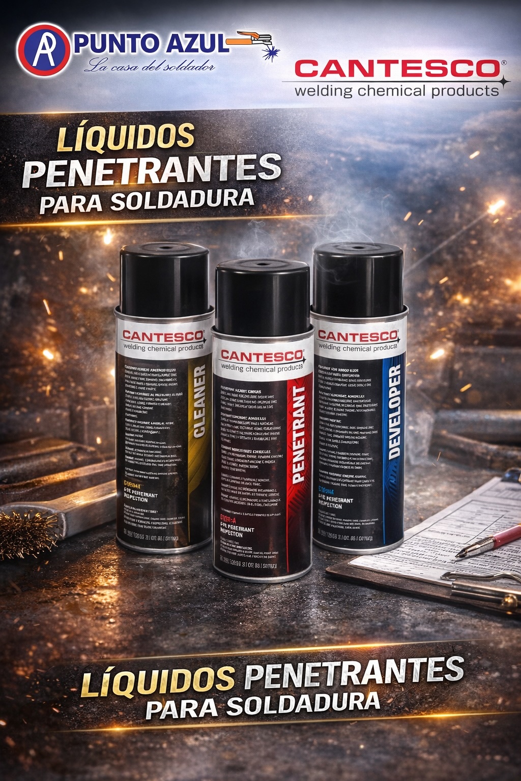 En Punto Azul – La casa del soldador, sabemos que una buena soldadura no solo se ve bien por fuera, sino que debe ser segura, resistente y libre de defectos internos. Por eso, trabajamos con marcas líderes como CANTESCO, especialista mundial en líquidos penetrantes para ensayos no destructivos (END).